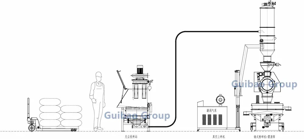 Process: Dust-Free Feeder - Vacuum Conveyor - Comminuting Mill - Vibrating Screen