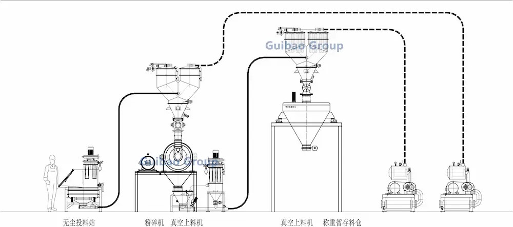 Process: Dust-Free Feeder - Vacuum Conveyor - Universal Grinder - Vacuum Conveyor - Weighing Buffer Hopper
